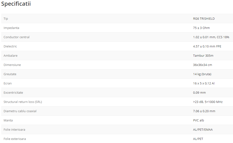 Cablu Coaxial RG6 triplu ecranat (recomandat pentru distante mai mari de 50 m)