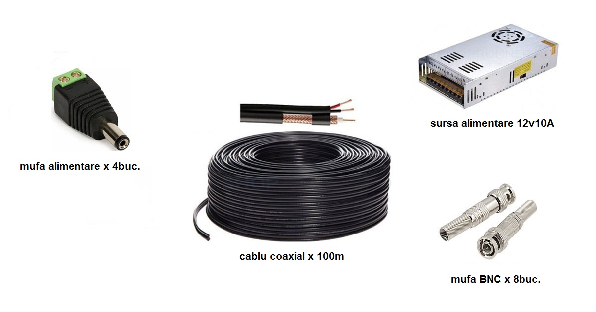 Kit accesorii instalare pt 4 camere, 100m cablu COAXIAL